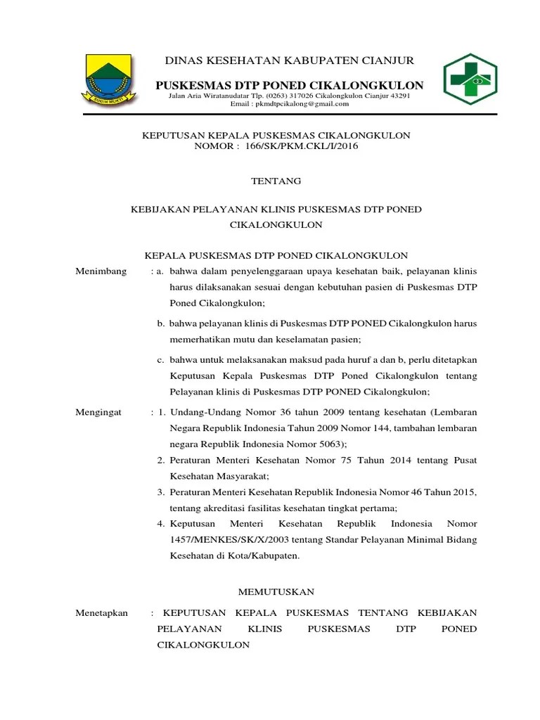 Contoh Sk Tentang Standar Layanan Klinis - Contoh Surat Keputusan Kebijakan Pelayanan Klinis Di Puskesmas - Keputusan kepala puskesmas guguk panjang nomor: